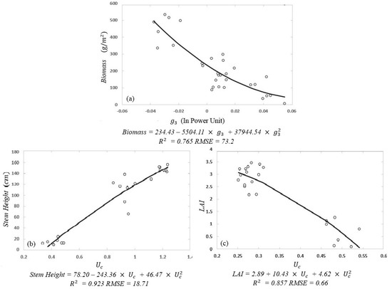 In this paper, the main objective is to find the feasibility of the RF model for growth parameters with CP parameters, so the PF model was investigated in this paper for the inversion of these three growth parameters. The number of regression trees for RF here was decided according to the stable regression root mean square error (RMSE) with the given set of training input-output pairs (i.e., CP parameters: biomass/stem height/LAI). For these three growth parameters, ntree is 500. At each node per tree, mtry is nine, which was randomly selected as 1/3 from all 27 CP parameters. The importance of each CP observable for the three growth parameters’ inversion is also introduced through Figure 9. In Figure 9, we observe that some CP parameters like ,, , etc., which showed the potential for the inversion of growth parameters physically according to the analysis in previous sections, also showed high importance in the RF algorithms. However, there were also other CP parameters like and for biomass inversion, m and for stem height inversion, and surface scattering m--s for LAI inversion that showed inconspicuous coincidence with growth parameters, also showing high importance in RF. The phenomenon was interpreted as the valuable selection ability of RF in modeling for growth parameters inversion, especially in a nonlinear system, for which is commonly difficult to decide which variable to remove. It also confirmed that it was difficult for the physical interpretation of vegetation scattering mechanism for RF inversion models. Similar to the previous section, the 101 fields were divided into 44 groups according to their DAS for biomass inversion. The estimation model training was based on 33 average results, and 11 were left for validation. However, 101 fields were divided into 33 groups according to their DAS for stem height and LAI inversion because of the fewer field campaigns for stem height and LAI records. Twenty two groups in the total of 33 were chosen for model training, and the remaining 11 for validation. We use the determination coefficient (R2) and RMSE between the estimated results and field measured results to assess the inversion accuracy. Since regression models were popular for crop growth parameters inversion; we performed some similar regression models like the linear model, quadratic model, power model, index model and the logarithm model for growth parameters’ inversion according to the sensitivity of CP parameters to the growth parameters, which were analyzed above. Among all of these models, the quadratic model had the best estimation accuracy and RMSE compared to the other models for all growth parameters. The best CP parameter for biomass inversion was and for stem height and LAI was ; the detail for R2 and RMSE is shown in Table 3. The optimal models and related equations for three growth parameters are shown in Figure 10. In Figure 10a is the best single parameter regression model for biomass; Figure 10b is the best single parameter regression model for stem height; Figure 10c is the best single parameter regression model for LAI. Table 3 describes the details of the estimation results. Table 3 shows the RF results at the main growth stages of P2, P3 and P4 for biomass, stem height and LAI. The validation test results described in Table 3 showed high estimation accuracy of RF for the three growth parameters. The determination coefficient (R2) between the estimation values and measured values for biomass was 0.93 with RMSE = 46.24 g/m2. The R2 for LAI is the highest among the three growth parameters, which was 0.96 with RMSE = 0.25. The R2 for stem height is 0.95 with RMSE = 13.5 cm. The relative significance level for all of the models was p < 0.001.