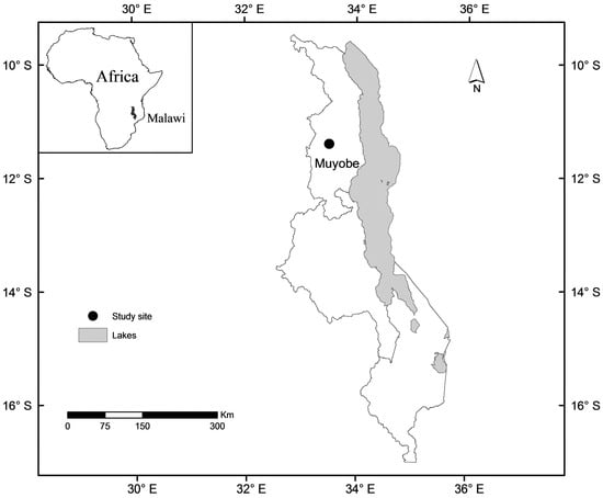 The study area, Muyobe community forest reserve, is located in Mpherembe traditional authority in Mzimba district in the northern region of Malawi (11°35′S, 33°65′E, 1169–1413 m above sea level) (Figure 1). The forest reserve is 486 ha in size, which is common for most small- to medium-sized forests in Malawi. The dominant soil type in the area is Ferrosols [48]. For the nearest weather station in Mzimba, located 69 km south of the study area, the mean annual rainfall was 889 ± 146 mm and the mean annual daily minimum and maximum temperatures were 15 ± 1.6 °C and 26 ± 0.6 °C, respectively, for the period 1975 to 2005. The forest is covered by miombo woodlands dominated by Julbernadia globiflora, Diplorhychus condylocarpon and Combretum zeyheri. For more details on the study area, see Kachamba et al. [32].