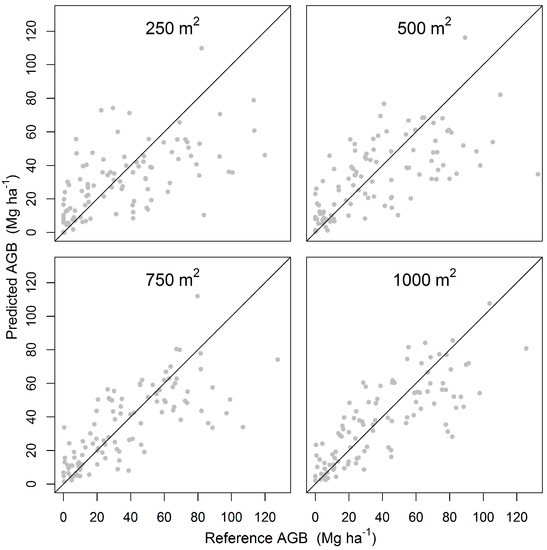 Figure 2. Field reference aboveground biomass (AGB) versus predicted AGB for models from different sample plot sizes, i.e., 250 m2, 500 m2, 750 m2 and 1000 m2.