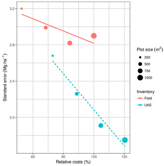 The smallest SE was obtained using 1000 m2 sample plot size in a UAS-assisted inventory. However, relative cost of this inventory was the highest amongst the tested sample plot sizes (Figure 3). Furthermore, the decrease in standard error was larger for UAS-assisted compared to field based when increasing plot size. Thus, there is a trade-off between inventory costs and required precision. Our results show that small sample plots are desired to keep the inventory cost low. However, if a standard error of less than approximately 3 Mg ha−1 was targeted, then a UAS-assisted forest inventory should be applied to ensure more cost effective and precise estimates.