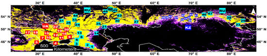 Land cover stability in Ukraine (UA), southern Russia (RU), and northern Kazakhstan (KZ) as revealed by International Geosphere Biosphere Programme (IGBP) global land cover classification scheme MODIS 0.05° cropland (IGBP class 12) land cover products for 2003–2010. For details on how the land cover stability analysis was conducted, please refer to [,]. In this figure, Yellow = stable core area; Magenta = unstable peripheral areas; Black = no occurrence of the given land cover class. Overlaid are the 49 specific cropland and one mixed forest (site 50—most northern site) study sites. The AMSR-E pixels are numbered from lower to higher latitude. Modified from []. Site names, latitudinal and longitudinal coordinates for all the study sites can be found in Table A1.