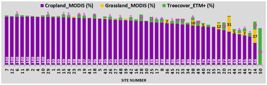 Average cropland (purple), and grassland (orange) cover in percent for 2003–2010 from the MODIS IGBP Land Cover Type 1 Percent Product at ~5.6 km spatial resolution MCD12C1 [], and tree cover fraction (%) in 2010 from the Landsat ETM+ 30 m resolution Global Land Cover product []. X-axis indicates study sites numbered from lower (1) to higher (50) latitudes. Figure 1 shows the latitudinal distributions of the study sites and countries in which they are found. Sites are sorted from largest (left) to smallest (right) cropland cover percent. Site 50 is a Mixed Forest site, in Mari El, RU. Note that summation of land cover proportions can exceed 100% at some sites, because the tree cover data source is different and at a different scale from the other two land cover classes. Cropland cover in some sites might be larger than what is presented here, since the MODIS land cover data has a separate class named Cropland/Natural Vegetation Mosaic (CNVM, IGBP class 14), which is not illustrated here to avoid overlap with the tree cover data. Land cover values >5% are labeled on the respective bars. These MODIS land cover data are also used in [].