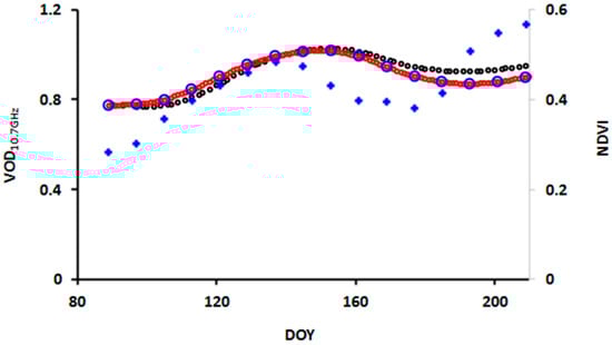Example of the filtering and temporal alignment of the vegetation optical depth (VOD) data with MODIS data. The unfiltered VOD time series appears in the black circles, the eight-day forward moving average filtered VOD data appears at the blue circles, and the MODIS NBAR NDVI appears in blue pluses.