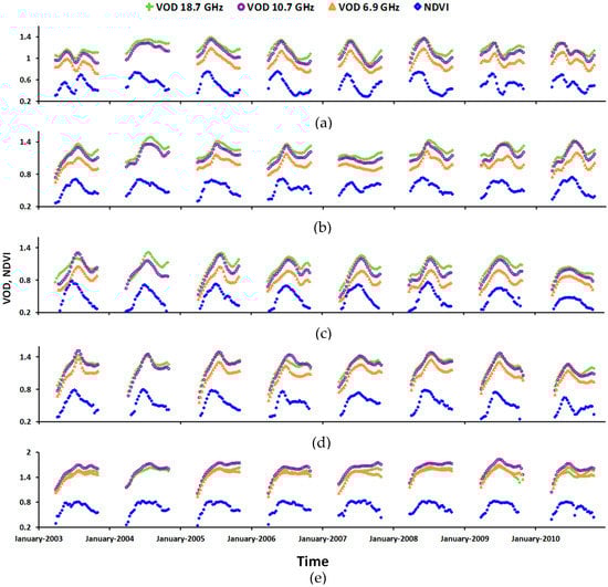 VOD time series for the three microwave frequencies: green pluses = 18.7; purple circles = 10.65; orange triangles = 6.925 GHz; and blue diamonds = NDVI. Selected series arranged from south to north of our study region: (a) Stavropol, RU, site 2; (b) Kirovohrad, UA, site 15; (c) Petropavlovsk 3, KZ, site 42; and (d) Kazan, RU, site 49; and (e) Mari El, RU, site 50 (MFO site included for contrast). Note that the VOD range for the MFO site is higher (0.2–1.9) than the range for the cropland sites (0.2–1.6).
