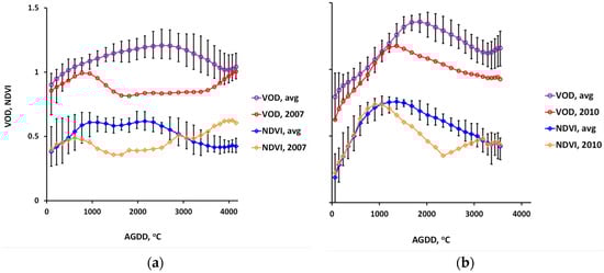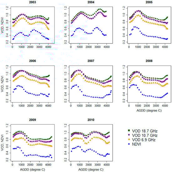 LSPs at the lower latitudes within the region exhibit longer and/or bimodal patterns arising from the cultivation of winter grains (Figure 4a,b). On the other hand, LSPs at the higher latitudes exhibit shorter unimodal growing season due to cultivation of spring grains (Figure 4c,d). At each study site, the VOD and NDVI exhibit similar seasonal patterns, amid interannual variation. For example, in Petropavlovsk 3, KZ (Figure 4c), in 2003 there was high and earlier peak LSPs in fewer AGDD, while in 2010 there was lower and flatter peak in more AGDD, due to the 2010 heatwave affecting European Russia [,]. Note the 2007 VOD in Kirovohrad, UA (Figure 4b) is almost flattened compared to other years, due to the devastation of crops by the 2007 heatwave in Ukraine []. The heatwave effect is more evident on the VODs compared to their counterpart NDVI (Figure 4b), due to the sensitivity of VODs to vegetation water content. The Mari El mixed forest site in Russia displayed a distinct LSP in magnitude and shape compared to the rest of the 49 cropland sites (Figure 4e). Both VOD and NDVI were larger in magnitude (note the y-scales) and flatter in shape. The VODs in particular showed a much-delayed senescence compared to the NDVI. The magnitude and peak timing of VOD were found sensitive to woody plant foliage, whereas NDVI seasonality was governed by the green herbaceous vegetation [,,].