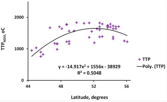 The NDVI CxQ model fits for all sites are high with 0.78 < R2 < 0.99. Sample fits appear in Figure 6. Sites at lower latitudes that can support double growing season attain their first peaks at the earliest (<1000 AGDD, e.g., Figure 6d, Cherkessk, RU, 44°); moving farther north, the seasonal pattern shifts from bimodal to unimodal, and the TTPNDVI is pushed up further to the growing season (between 1000 and 2000 AGDD, e.g., Figure 6c, Zaporiyhzhya 1, UA, 48° and Figure 6b, Kokshetau 1, KZ, 53°). Moving towards the northern study sites, the TTP starts to decrease to 1000 AGDD due to the thermal limitation and shorter growing season (e.g., Figure 6a, Cheboksary, RU, 56°). Figure 7 presented the general relationship of TTPNDVI as a function of latitude for all sites. Note also the NDVI CxQ fit intercept in the different latitudes in Figure 6 that the growing season in the lower latitudes (e.g., Figure 6d) starts a bit earlier than the time we considered in this study (DOY 89 = March 30 (March 29 in leap years)).