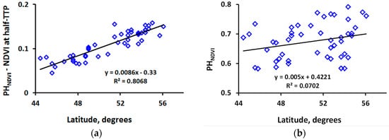 Scatterplot for: PHNDVI minus NDVI at half-TTP (NAHT) as a function of latitude (a); and PHNDVI as a function of latitude (b). Both are fitted with linear trend line yielding strong correspondence for the former (R2 = 0.81), but no clear correspondence for the latter (R2 = 0.07).