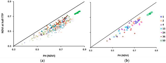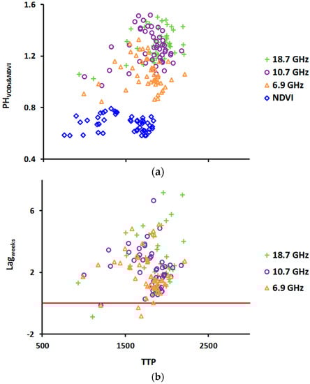 Scatterplots of: (a) the PHVOD determined by maximum value and the PHNDVI from the CxQ model as a function of their corresponding TTP; and (b) PHVOD lags relative to their corresponding PHNDVI as a function of the respective TTP VODs. Details can be found in Table A1.