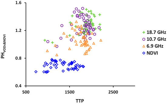 Scatter plot of the maximum value approach determined PH VODs and NDVI as a function of their corresponding TTP. Note the magnitude of the VODs and NDVI PHs; VODs PH lagged their counterpart NDVI PH; and also the lag among the VODs PH relative to their microwave frequency.