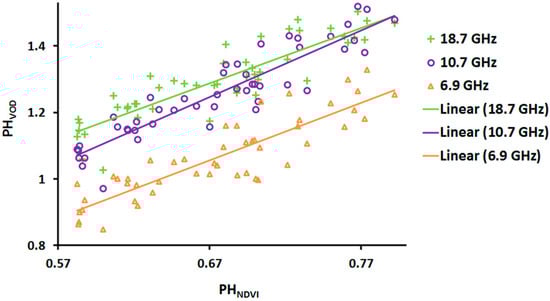 Scatterplots and linear regression fits of the CxQ model derived PHNDVI and maximum value determined PHVOD at three microwave frequencies (6.925 GHz (orange triangles), 10.65 GHz (purple circles), and 18.7 GHz (green plus)) for 2003–2010. The PH linear fits for two datasets were high with coefficients of determination of 0.77, 0.84, and 0.78 for the 6.925, 10.65, and 18.7 GHz frequencies, respectively.