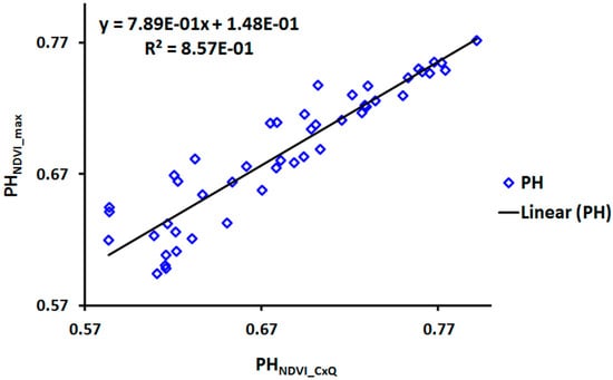 Scatterplot and linear fit between the PHNDVI derived from the CxQ model and the PHNDVI determined by the maximum-value method from the same MODIS dataset for 2003–2010. The linear fit for the PHNDVI from the two approaches of the same dataset was high with R2 = 0.86.