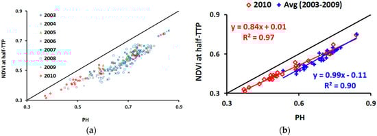 Scatter plots of: (a) NDVI at half-TTP as a function of PHNDVI derived from a CxQ model for the 2010 heatwave affecting Russia and Kazakhstan; and (b) the 2010 data and the average data for the rest of the years (2003–2009). Note in (a) the position of the 2010 phenometrics presented by red diamonds relative to the other years in their respective sites. Note also the 2010 marker for the upper-right corner, which is for the MFO site in Mari El, Russia.