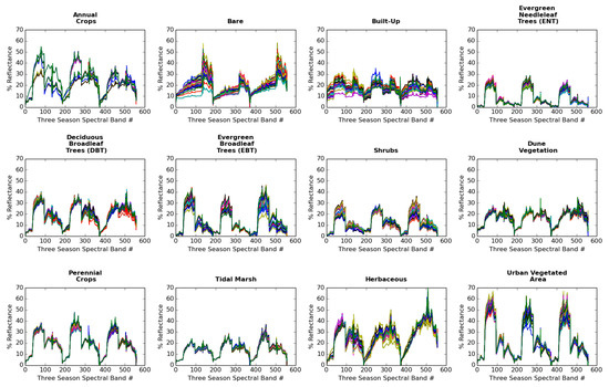 Twenty-five randomly selected three-season reflectance spectra from each of the twelve LCCS classes. Note that the x-axis is the band number (1–558) with seasons in spring- summer-fall sequence. Bad bands have been removed within each season (186 bands per season).