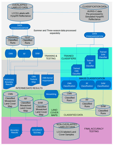 A broad goal of this study is to assess the accuracy of a 1-D CNN for classifying land cover from multi-seasonal hyperspectral imagery. Accuracy from this CNN is compared to those from the two leading machine learning classification methods in remote sensing, RF and SVM. These methods were utilized as a control group due to their high accuracy rates, high prevalence within the field and the robust libraries available for their implementation. In order to support applications based on spaceborne hyperspectral imagery, our analyses were performed with simulated Hyperspectral Infrared Imager (HyspIRI) imagery, a satellite mission currently being considered by NASA. Our analyses are regional in scale, covering the San Francisco Bay Area, California, and land-cover classes followed the global Land-Cover Classification System (LCCS) [27].