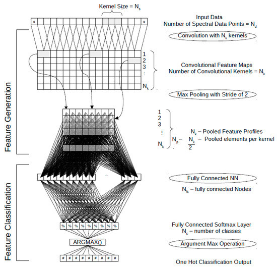 At a broad level, a CNN is a deep-network topology that typically combines convolutional filter layers in conjunction with a classification network, which for this work is a fully connected Neural Network (NN). Through the standard back-propagation training process, convolutional filters are trained to capture salient structural feature information from the sequential input data. Hu and colleagues [17] mention these structural features as the “intraclass appearance and shape variation” within spectra. As an extension from this previous literature, here we demonstrate that these structural features actually represent those features present within the data that distinguish the classes from each other. The architecture feeds these features, or filtered input data, into a subsequent classification process.