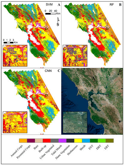 The mosaicked classified maps created with RF, CNN and SVM are shown in Figure 8. At this scale, it is visible that all classifiers map land cover relatively well, and are relatively consistent throughout their respective classification. In general, the RF map tended to be more speckled than SVM or CNN maps. The RF map had more obvious problems with classifying shrublands in the southeast corner of the map (Figure 8B), with over-mapping of Perennial Crops; RF also had over-mapping of Built-up in the Tidal Marsh areas along the northeast bay. Some class differences toward the coast, such as near San Francisco, are explained by clouds in the imagery that were not fully masked from the analysis.