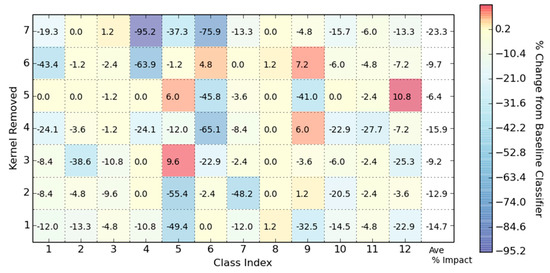 Kernel Importance Matrix. This table shows the percent change in producer accuracy when zeroing a kernel from the CNN. Class index definitions found in Table 3.
