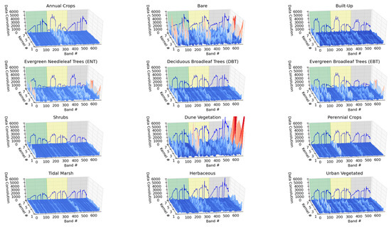 The application of CNN to hyperspectral data has only recently been explored and there are thus many avenues for future work. The consideration of the spatial domain is an area of current investigation. The extension of this architecture to include the spatial dimension as in [13] could continue to add more distinctive information that could aid in the classification process. A 3-D convolutional network paired with a respective importance figure (Figure 9) could shed light on to the spatial as well as the spectral features that impact the classification on a per class basis. In a similar manner, the temporal dimension of image data should be investigated. As in this study, this could be done by vertically stacking the temporal season data creating a sized input data array, where is the number of bands within a single season of image data and is the number of seasons (rather than horizontally stacked data in temporal sequence, as in our study). This data format would dictate the architecture of networks that could convolve higher dimension kernels across the input data, or perform multiple layered convolutional operations. The additional benefit would be that the kernel’s local receptive field could enable the network to capture patterns within the temporal and spectral dimensions in an integrated machine-learning framework. If there is distinctive information within these dimensions, this could increase the accuracy as well as provide more ancillary information about the distinctive aspects of the data through analysis of convolutional feature maps.