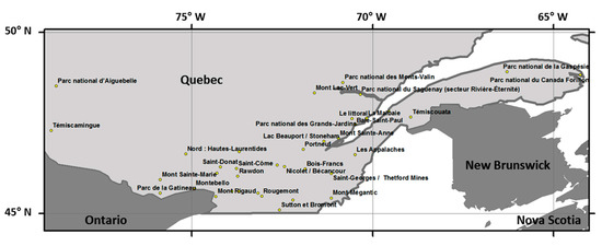 Location of the 38 ground observation sites in Southern Québec, Canada.