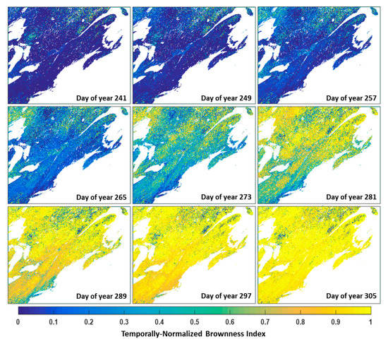 In this study, a time-series of satellite imagery was analyzed to obtain the temporally-normalized brownness index [21]. This index, which is described in this section, was used to model the autumn foliage coloration phase and link it with the fraction of colored leaves. The advantage of using the brownness index for this purpose is its independence of the surface background, vegetation abundance, and species composition. Therefore, it is suitable for the diverse forests in the study area, which cover over 200,000 km2, ranging from boreal to deciduous and mixed forests.