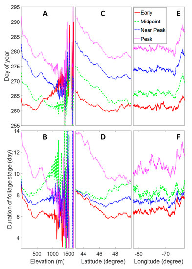 Moreover, the timing of the onset of each foliage coloration phase and its duration are strongly related to elevation, and latitude, but display a weak relation to longitude (Figure 3). The analysis of MODIS observations across the study area shows that high elevation pixels are associated with poor data quality, possibly because of high cloud coverage (Figure 3A,B), which results in noisy retrievals of foliage phase onset and duration. In elevations up to 500 m, as elevation increases, autumn foliage starts sooner, and the duration of each phase is shortened. In elevations above 500 m, however, the data becomes noisy. Due to this noise, the correlation between satellite data and elevation is lower than for ground data. A similar trend is shown for latitude (Figure 3C,D): at northern latitudes the onset of each autumn foliage phase is sooner, and the duration of the peak coloration phase is shortened. On the other hand, longitude does not seem to have an effect on the onset and duration of autumn foliage phases (Figure 3E,F), except for the most eastern region in the study area (the Maritimes and the Gaspé Peninsula), where autumn foliage begins later, and lasts longer compared to the rest of the study area. This is probably the result of the proximity of this region to the ocean, which moderates temperature changes, as well as differences in species composition. These findings provide additional support to Hopkin’s Law of Bioclimatics, and suggest that temperature is likely a main driver of variation in autumn foliage progression.