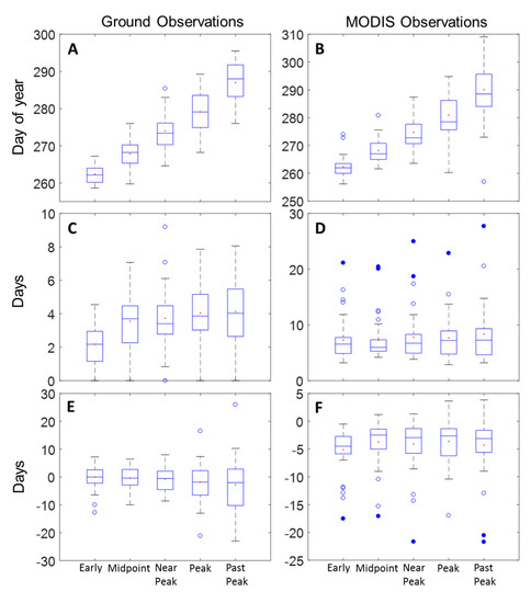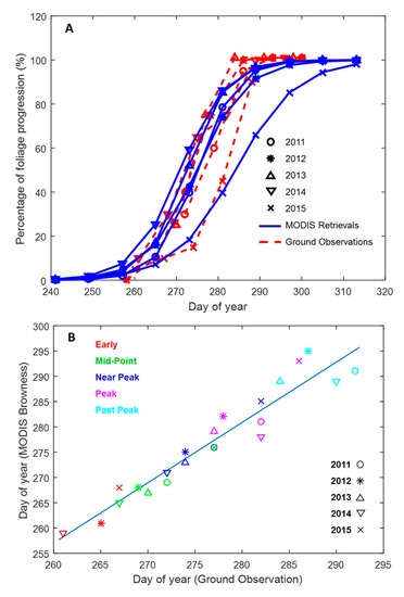 Another unavoidable caveat of this study is the use of the ground observations as ground truth. Unlike previous studies that used few sites with strong control over field data collection protocols [9,20,21,22], our study used data collected in multiple sites with little control over observation protocols and accuracy. The classification of foliage progression into six coloration phases (beginning soon, early, midpoint, near peak, peak and past peak) may reduce observation errors of the fraction of colored foliage, however, because the observations are performed by different personnel, at different locations, and where the vegetation composition is different, this can result in some bias in those ground estimations. As a result, our ability to confidently extrapolate these subjective observations over large areas is limited and varies between sites. On the other hand, it is quite remarkable that a significant correlation exists between MODIS pixels that are 25 ha in area, and in-situ observations that probably cover only a fraction of that area. Therefore, bias in ground estimations of autumn foliage progression might affect the apparent error in satellite based estimations of foliage progression. Other studies that used ground red-green-blue (RGB) cameras [14,15,20] to validate satellite phenology retrievals, encountered similar issues with scale and representativeness of images acquired by ground cameras. To a certain extent, this inhibited the correlation between ground and satellite remote sensing of forest phenology. Therefore, it seems that some degree of inconsistency between ground and spaceborne observations of autumn foliage progression is unavoidable, but should be minimized as much as possible.
