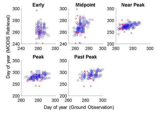 The onset of each autumn foliage coloration phase as estimated in-situ compared with MODIS retrievals during 2011–2015 across all sites. Red asterisks depict data from the four outlier sites.
