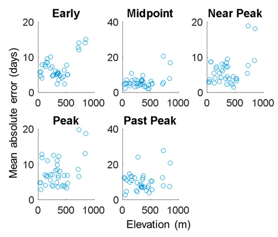 In most sites, a significant correlation was found between ground observations and MODIS retrievals (Table 3). Figure 5 shows an example of a relatively good correlation between the two types of phenological monitoring at the Mont Sainte-Marie site. However, the temporally-normalized brownness index mismatches the ground observations of foliage progression in four locations (Gaspésie National Park, Monts-Valin National Park, Mont Lac-Vert, d’Aiguebelle National Park). The linear correlation between ground observations and MODIS retrievals of the start day of each autumn foliage phase is not significant in these four sites. The MAE of each autumn foliage phase in these sites is also relatively high (Table 3), and therefore the MODIS retrievals at these sites are considered as outliers. This mismatch might be the result of a highly clouded environment over those sites that degraded the quality of the MODIS time series. Additionally, both Gaspésie National Park and Monts-Valin National Park are high elevation sites which, as shown in Figure 3A,B, are prone to data gaps due to cloudiness and poor quality imagery. Figure 6 shows the scatterplots summarizing the onset day of autumn foliage coloration phases between in-situ measurements and MODIS retrievals for 2011–2015 at all sites. There is a highly significant positive linear correlation between ground observations and MODIS retrievals (R2 = 0.48, p < 0.001), and this correlation is further improved when excluding the four above mentioned outliers from the analysis (R2 = 0.58, p < 0.001). The MAE across all sites and all coloration phases is 7 days, and improves to 6.32 days by removing the outliers (6.23, 5.24, 5.21, 6.9, 8.55 days for the early, midpoint, near peak, peak and past peak coloration phases). Accordingly, the MAE for the early, midpoint, near peak, and peak coloration phase are all lower than the temporal resolution of the ground observations (7 days) and therefore acceptable, while the MAE at the past peak coloration phase is slightly higher. Figure 7 shows the MAE per site at each coloration phase as a function of the site elevation, and demonstrates that high elevation sites have the highest retrieval errors.