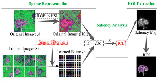 It is noticeable that the data sets of remote sensing images have a high volume of dimensional information, which is usually too large to handle effectively. Aiming at this problem, sparse codes have been introduced into image processing. Sparse codes learned from image patches are similar to the receptive fields of simple-cells in the primary visual cortex (V1) [37], which shows that the mechanism of human visual saliency is consistent with sparse representation. Sparse representation has also been shown to be a quite effective technique for wiping out non-essential or irrelevant information in order to reduce the dimensions. Furthermore, it has greater flexibility for data structure capture, and better stability against perturbations of the signal, which suggests that we can obtain the sparse coefficients produced by those basic functions with good robustness against noise or corruption.