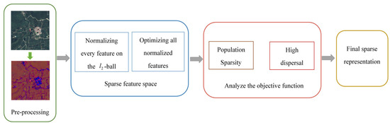 Each pixel column is viewed as a feature in our model. A feature matrix will be obtained after remote sensing image preprocessing. Each row of the matrix represents a feature and each column is a patch divided from the image. represents the jth feature value (rows) for the ith patch (columns). This sparse representation method aims to optimize and normalize the feature matrix by rows (feature values), then by columns (vectored image patch) and finally sums up the absolute value of all entries.