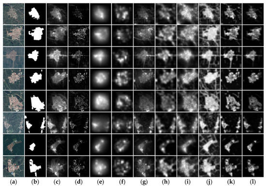Saliency maps by our proposed model and nine competing models on Google Earth images. (a) Origin images; (b) Ground truth; (c) CA; (d) FT; (e) GBVS; (f) ITTI; (g) WT; (h) SR; (i) MFF; (j) SACH; (k) FDA and (l) Ours.