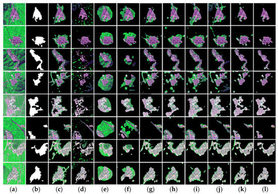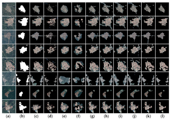 ROIs extracted by our proposed model and nine competing models on SPOT 5 images. (a) Origin images; (b) Ground truth; (c) CA; (d) FT; (e) GBVS; (f) ITTI; (g) WT; (h) SR; (i) MFF; (j) SACH; (k) FDA and (l) ours.
