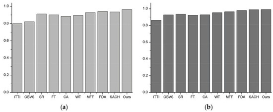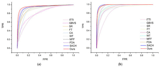 where, for an image, denotes the ground truth, denotes the saliency map after the binary image, and denotes the coordinate of the images. A higher TPR value indicates a better performance when the FPR value is the same and, conversely, better performance depends on a smaller FPR value at the same TPR value. The area beneath the curve is called the Area Under the Curve (AUC). Thus, a larger AUC indicates better performance. The AUCs of all the models are shown in Table 1 and Table 2. From the Tables we can see that our model obtains the largest value of AUC compared to the other nine competing models, thus achieving better performance.