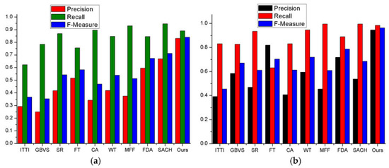 From Figure 11a,b the precision of our model is obviously much higher than the other nine competing models, which means our model returns substantially more salient regions than background regions. Based on the previous qualitative analysis, the CA, WT, SR, MFF, SACH and FDA models achieve higher recall than the proposed model, probably because these models capture not only salient areas but some little non-salient regions with blurred boundaries. Meanwhile, this can be obtained clearly and reasonably according to Equation (17). Although the Recall is not the highest among these models, and in Google Earth dataset our ROC curve is slightly worse than SACH, our model still achieves the highest F-measure, thus showing better performance than others on different kinds of remote sensing images.