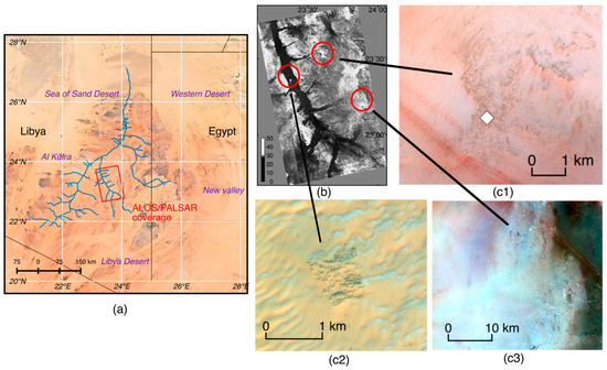 (a) Satellite image coverage of the study site. The background image is from Google Earth and is georeferenced in QGIS. The blue lines denote the paleo-drainage system which is visible within the ALOS/PALSAR image [12]. The red rectangle is the coverage of one ALOS/PALSAR frame, which shows the study site; (b) the ALOS/PALSAR HH amplitude image (70 × 110 km); (c1–c3) show three areas: (c1) appears to be the plants covered by sand (white diamond denotes the location of a reference point used in InSAR processing), (c2) showing a bright spot in the channel area (b), which also appears to be plants covered by sand and (c3) showing a bright area in the ALOS/PALSAR image, which may be outcrop rocks.