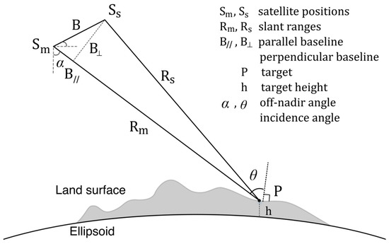 The geometry of SAR Interferometry. The subscripts of m and s denote the master and slave images of an InSAR image pair.