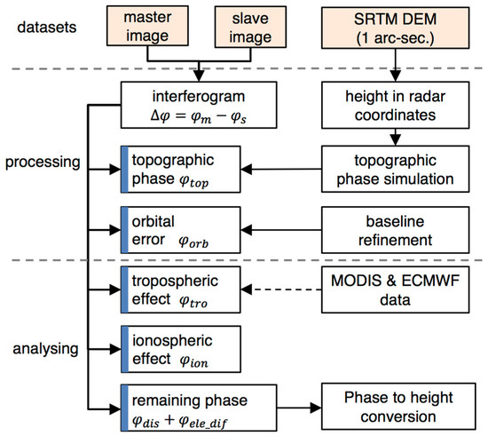 In conventional differential SAR interferometry, the remaining phase after removing the orbital and topographic phase, which is termed the differential phase, should include , , , and . However, if an L-band SAR image pair is utilised to form an interferogram and an external C-band SRTM DEM is employed to simulate the topographic phase, an additional phase component, , which results from the difference between L- and C-band, should be included. Therefore, the differential phase in Equation (2) changes into Equation (3). Equations (4) and (5) express the phases caused by topographic variation and surface displacement , where are the perpendicular baseline, slant range, and incident angle, respectively. A flowchart of the InSAR processing and analysis of phase components is shown in Figure 3.