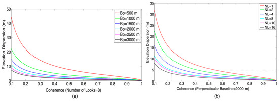 Relationship between coherence and elevation dispersion in (a) different perpendicular baselines and (b) different numbers of looks; Coherence needs to be above 0.218 to limit elevation dispersion below 5 m when NL = 8 and PB = 2000 m are applied (Parameters used in the calculation is from ALOS/PALSAR system: ).