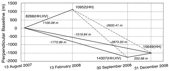 The temporal and spatial baselines of the four ALOS/PALSAR images were calculated and are shown in Figure 6. Six radar image pairs can, in theory, be formed by using the four radar acquisitions. However, two of the pairs (13 February 2008–30 September 2008 and 13 February 2008–31 December 2008) have large perpendicular baselines beyond 2000 m, which cause difficulties for co-registration. Thus, only four radar image pairs were processed in this study. InSAR processing was applied to the four ALOS/PALSAR InSAR image pairs of 13 August 2007–13 February 2008, 13 August 2007–30 September 2008, 13 August 2007–31 December 2008, and 30 September 2008–31 December 2008.