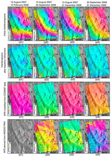 (a1–a4) Initial interferograms derived from SAR image pairs of 13 August 2007–13 February 2008, 13 August 2007–30 September 2008, 13 August 2007–31 December 2008, and 30 September 2008–31 December 2008; (b1–b4) Interferograms after baseline refinement. Primary trend of phase variation has been removed; (c1–c4) Atmospheric Phase Screen (APS) modelled from ECMWF data; (d1–d4) APS derived from MODIS (Terra L2 product from collection 006) near-infrared Precipitable Water Vapour (PWV). There is almost no data in this area on 13 February 2008 because it was a cloudy day. The absence of data in the upper left corner of (d2) and (d4) is because cloud appears there on 30 September 2008 (The orbit number is 14307). The striping artifact in (d1–d4) is caused by well known uncorrected radiometric calibration differences.
