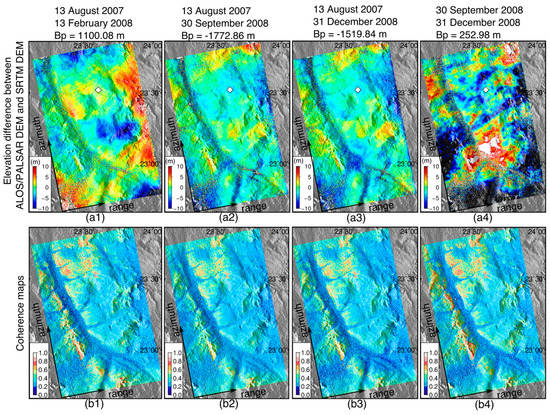 (a1–a4) Elevation difference maps converted from interferograms shown in Figure 7(b1–b4). These represent elevation differences between ALOS/PALSAR L-band DEMs and SRTM C-band DEMs; (b1–b4) Coherence maps of the four InSAR pairs.
