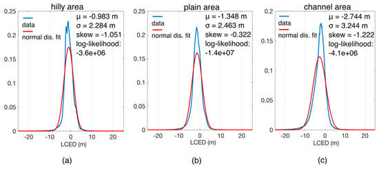Figure 10a–c show the histograms of the LCED within each group along with normal distributions fitting to the histograms. From these histograms and normal distributions, we can observe increasing negative elevation differences in the plain and channel areas compared to those in the hilly area. Although some locations in the hilly areas show positive elevation differences, the mean value is still negative, as we can see in Figure 10a. The elevation difference in the hilly area is −0.983 ± 2.284 m, whilst in the plain area and channel area, it is −1.348 ± 2.463 m and −2.744 ± 3.244 m, respectively. The standard deviation is relatively large, which may result from the inclusion of many measurements of low coherence. However, we cannot totally rule these out because the penetration process is more likely to occur where the coherence is low. Thus, we only rule out measurements of coherence lower than 0.218. The larger skewness of the hilly area and channel areas indicate that more measurements tend to show negative shift values of LCED.