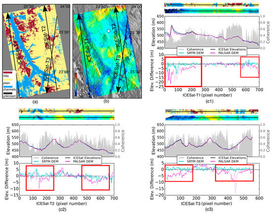 (a) The classification result, which is the same as Figure 9d; (b) Elevation difference map of the L-band PALSAR DEM and C-band SRTM DEM averaged from Figure 8(a2,a3); (c1–c3) Comparisons between ALOS/PALSAR InSAR derived DEM, SRTM DEM, and ICESat elevations along three ICESat transects (ICESat-T1/T2/T3) across the study site. The red rectangles in (c1–c3) highlight the areas where there is a negative shift of PALSAR DEM from SRTM DEM and ICESat elevations. The dashed lines in (c1–c3) are where the coherence is lower than 0.218.
