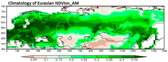Spatial distributions of the 34-year (1982–2015) spring (April–May, AM) NDVIsn climatology over Eurasia. The color scale changes from brown to green. The greener color represents the regions with higher NDVI values and corresponds to the locations with denser and greener vegetation. The brown color represents the regions with little or no vegetation.