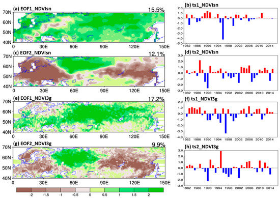 The first two EOF patterns and corresponding time-series obtained from spring NDVI over Eurasia for the period 1982–2015: (a) the mode of EOF1 in NDVIsn; (b) the time-series of EOF1 in NDVIsn; (c) the mode of EOF2 in NDVIsn; (d) the time-series of EOF2 in NDVIsn; (e) the mode of EOF1 in NDVI3g; (f) the time-series of EOF1 in NDVI3g; (g) the mode of EOF2 in NDVI3g; and (h) the time-series of EOF2 in NDVI3g. The variance explained by each EOF mode is shown on the right corner of figures in the left column.
