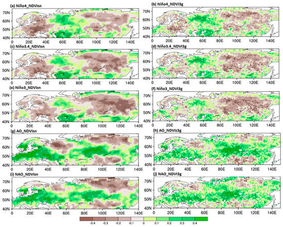 Spatial patterns of correlation coefficients between spring NDVI and winter climate indices over Eurasia: (a) NDVIsn and Niño4; (b) NDVI3g and Niño4; (c) NDVIsn and Niño3.4; (d) NDVI3g and Niño3.4; (e) NDVIsn and Niño3; (f) NDVI3g and Niño3; (g) NDVIsn and AO; (h) NDVI3g and AO; (i) NDVIsn and NAO, and (j) NDVI3g and NAO. Dotting areas have the correlation coefficient being statistically significant at the 0.1 level (i.e., p < 0.1) estimated by a local Student’s t-test.
