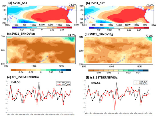 Spatial patterns and time-series of expansion coefficients for the first leading paired mode of winter SST (tropical Pacific) and ERNDVI for the period 1982 to 2015 via the SVD analysis: (a) the paired mode of SST using NDVIsn; (b) the paired mode of SST using NDVI3g; (c) the paired mode of ERNDVI using NDVIsn; (d) the paired mode of ERNDVI using NDVI3g; (e) the time-series of SST (black squares) and ERNDVI (red dots) using NDVIsn; (f) the time-series of SST (black squares) and ERNDVI (red dots) using NDVI3g. The time-series amplitudes are normalized based on standard deviation. The variance explained by each SVD is shown on the right corner in (a–d).