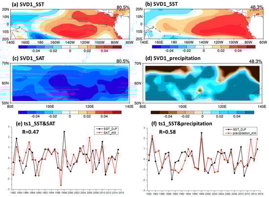 Spatial patterns and time-series of expansion coefficients for the first leading paired mode of winter SST (tropical Pacific) and spring surface air temperature (SAT) and precipitation over East Russia for the period 1982 to 2015 via the SVD analysis: (a) the paired mode of SST using SAT; (b) the paired mode of SAT; (c) the paired mode of SST using precipitation; (d) the paired mode of precipitation; (e) the time-series of SST (black squares) and SAT (red dots); (f) the time-series of SST (black squares) and precipitation (red dots). The time-series amplitudes are normalized based on standard deviation. The variance explained by each SVD is shown on the right corner in (a–d).