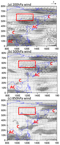 Composite anomalies of spring atmospheric circulation (unit: m/s) at (a) 200 hPa; (b) 500 hPa; and (c) 850 hPa in the EP El Niño years. East Russia is in the red box. Shading areas have the anomalies being statistically significant at the 0.1 level (i.e., p < 0.1) estimated by a local Student’s t-test.