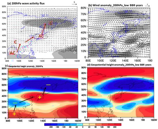 Composite maps of (a) wave activity flux at 200 hPa and (c) geopotential height anomalies at 200 hPa during spring in the EP El Niño years. Composite anomalies of (b) wind at 200 hPa and (d) geopotential height at 200 hPa during spring in the low-value BBR years. Shading areas in (a) and (b), and dotted regions in (c) and (d) have the anomalies being statistically significant at the 0.1 level (i.e., p < 0.1) estimated by a local Student’s t-test.